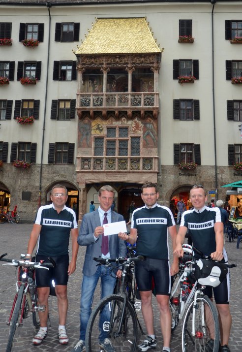 Heuer führte die mittlerweile 14. Benefiztour von Mingolsheim in Bad Schönborn (D) über die Schwäbische Alb nach München und schließlich nach fünf Tagen und rund 500 Kilometern nach Innsbruck. Vor dem Goldenen Dachl wurden die ambitionierten Radler von Sportreferent Vizebürgermeister Christoph Kaufmann am 9. Juli in Empfang genommen. Als Anerkennung für den sportlichen und sozialen Elan überreichte er Ihnen stellvertretend für die Stadt Innsbruck eine Spende: „Ich bewundere den engagierten Einsatz der drei Sportler über einen so langen Zeitraum. Mit dem gesammelten Geld können sie den Verein und seine Aktivitäten maßgeblich und nachhaltig unterstützen“, so Kaufmann.