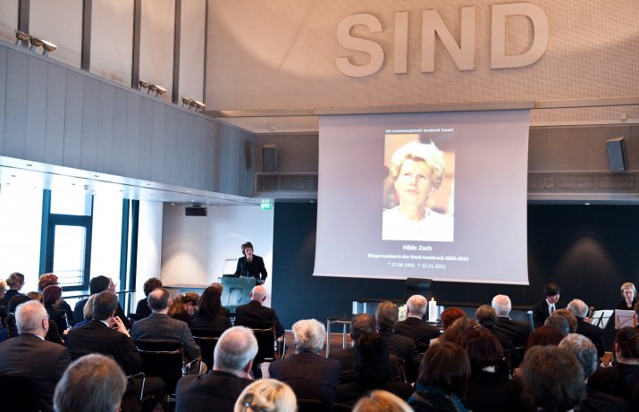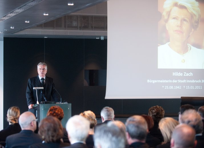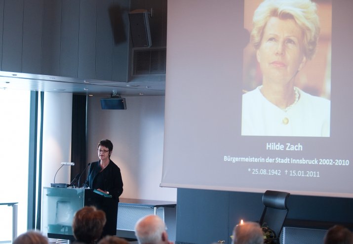 Bürgermeisterin Mag.a Christine Oppitz-Plörer dankte ihrer verstorbenen Amtsvorgängerin in einer bewegenden Rede für ihr Lebenswerk: „Hilde Zach ist mutig und konsequent ihren ganz eigenen Weg gegangen und hat viele sichtbar und spürbare Spuren in unserer Stadt hinterlassen. Sie war wesentlicher Motor, Innsbruck ein modernes Gesicht und ein weltoffenes Lebensgefühl zu geben.“ Hilde Zach habe sich mit ihrem unbändigen und umsichtigen Einsatz für die Agenden der Stadt und der immer spürbaren Sympathie, die sie den Menschen entgegen brachte, in den acht Jahren als Bürgermeisterin der Tiroler Landeshauptstadt die Liebe der Innsbruckerinnen und Innsbrucker im wahrsten Sinne des Wortes erarbeitet. „Wirtschaft mit Weitblick, Kultur als Herzensangelegenheit und Politik aus Leidenschaft – Hilde Zach zeichnete sich in allen Bereichen, in denen sie tätig wurde, durch herausragende Leistungen aus. Das brachte ihr großen Respekt ein, weit über alle Parteigrenzen hinweg“, so Bürgermeisterin Oppitz-Plörer. Hilde Zach habe mit ihrer pflichtbewussten Auffassung von Politik der Innsbrucker Stadtpolitik und dem Gemeinderat ein neues Selbstbewusstsein gegeben. „Hilde Zach war Bürgermeisterin mit Leib und Seele: Sie lebte die Politik, sie mochte die Menschen und sie liebte ihre Stadt, ihr Innsbruck! Ihr leidenschaftlicher Einsatz für Innsbruck, ihr Mut und Rückgrat, ihr Durchsetzungsvermögen und nicht zuletzt ihr soziales Wirken, ihr Verständnis, ihre Toleranz und ihrer Hilfsbereitschaft waren beispielhaft.“