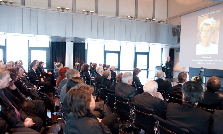 Der Gemeinderat der Stadt Innsbruck trat am 19. Jänner im Beisein der Trauerfamilie zu einer öffentlichen Trauersitzung im Plenarsaal zusammen. Die Gemeinderatsfraktionen erwiesen im Rahmen der Sondersitzung der am 15. Jänner verstorbenen Alt-Bürgermeisterin und Ehrenbürgerin Hilde Zach über die Parteigrenzen hinweg in sehr emotionalen und persönlichen Worten ihre Hochachtung. Der Platz, den Hilde Zach acht Jahre lang als Bürgermeisterin von Innsbruck einnahm, vorne in der Mitte des Plenarsaals blieb leer, geschmückt mit einem Blumenstrauß und einer Kerze, dahinter wurde ein Bild der Altbürgermeisterin projiziert.