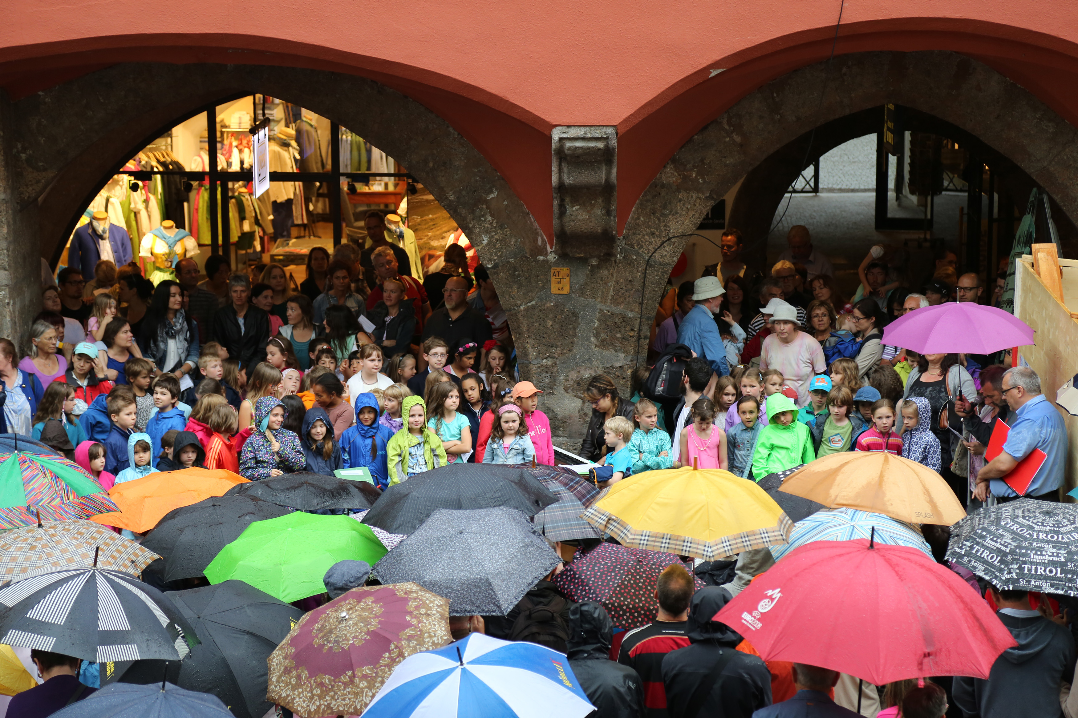 Bei der Eröffnung vor dem Stadtturm sangen die Kinder der Musikschule Innsbruck unter anderem, passend zum wechselhaften Wetter: "Sonnenschein darf nicht sein"