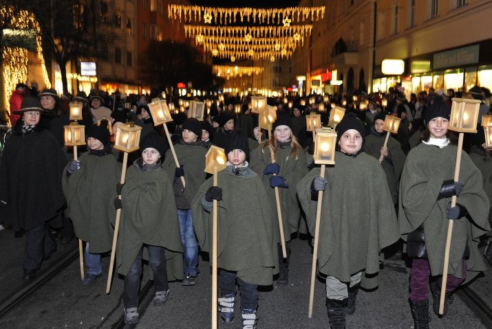 Um 17 Uhr setzt sich dann der feierliche Zug in Bewegung. Von der Triumphpforte führt der Weg über Maria-Theresien-Straße, Marktgraben, Herzog-Otto-Straße und Herrengasse bis zum Platz vor dem Tiroler Landestheater und bietet so reichlich Gelegenheit, den gesamten Zug zu bestaunen. Die Hirten und Engel mit ihren Laternen bringen einen warmen Lichterglanz in die Innenstadt und bereiten den Weg für das Christkind in seinem strahlenden, prunkvollen Wagen. An zwei Stationen (Rathaus, ca. 17.20 Uhr, und Marktplatz, ca. 17.40 Uhr) werden die traditionellen Lieder „Jetzt fangen wir zum Singen an“, „Kommet ihr Hirten“ und „Es wird scho glei dumpa“ gesungen, die sich als vorweihnachtliche Klangwolke über die Innsbrucker Innenstadt legen.