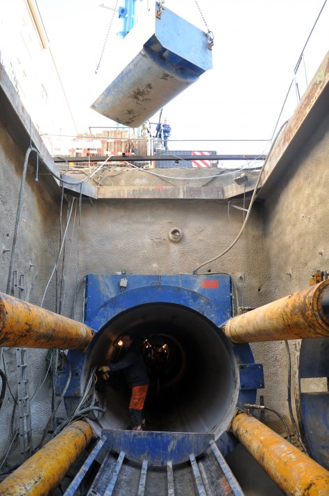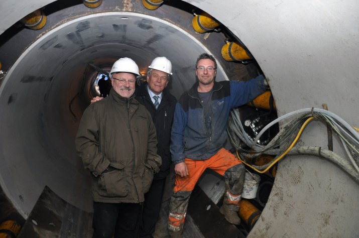 Etwa acht Meter unter der Oberfläche kommt dabei innovativste Technik zum Einsatz: Eine Vortriebsmaschine, auch Maulwurf genannt, arbeitet sich durch das Erdreich und gräbt dabei einen Schacht, in den die Kanalrohre mit einem Durchmesser von 2,2 Metern nachgeschoben werden. Dank dieser Methode sind kaum oberirdische Aufgrabungen notwendig und die Bauzeit halbiert sich. Gut 3.500 LKW-Fahrten für Materialtransporte können damit im Stadtgebiet eingespart werden, was auch die Lärm- und Feinstaubbelastung deutlich reduziert.