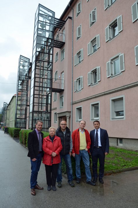 Einfacher, komfortabler und schneller gelangen die MieterInnen der Langstraße 6/10/12/18/22 ab sofort in ihre Wohnungen. Ermöglicht wird dies durch straßenseitig situierte Aufzugsanbauten, die auf Wunsch der MieterInnen von der Innsbrucker Immobiliengesellschaft (IIG) angebracht wurden. Gemeinsam mit IIG-Geschäftsführer Dr. Franz Danler und IIG-Bauleiter Martin Kiechl überzeugte sich Wohnungsreferent Vizebürgermeister Christoph Kaufmann vom Endergebnis.