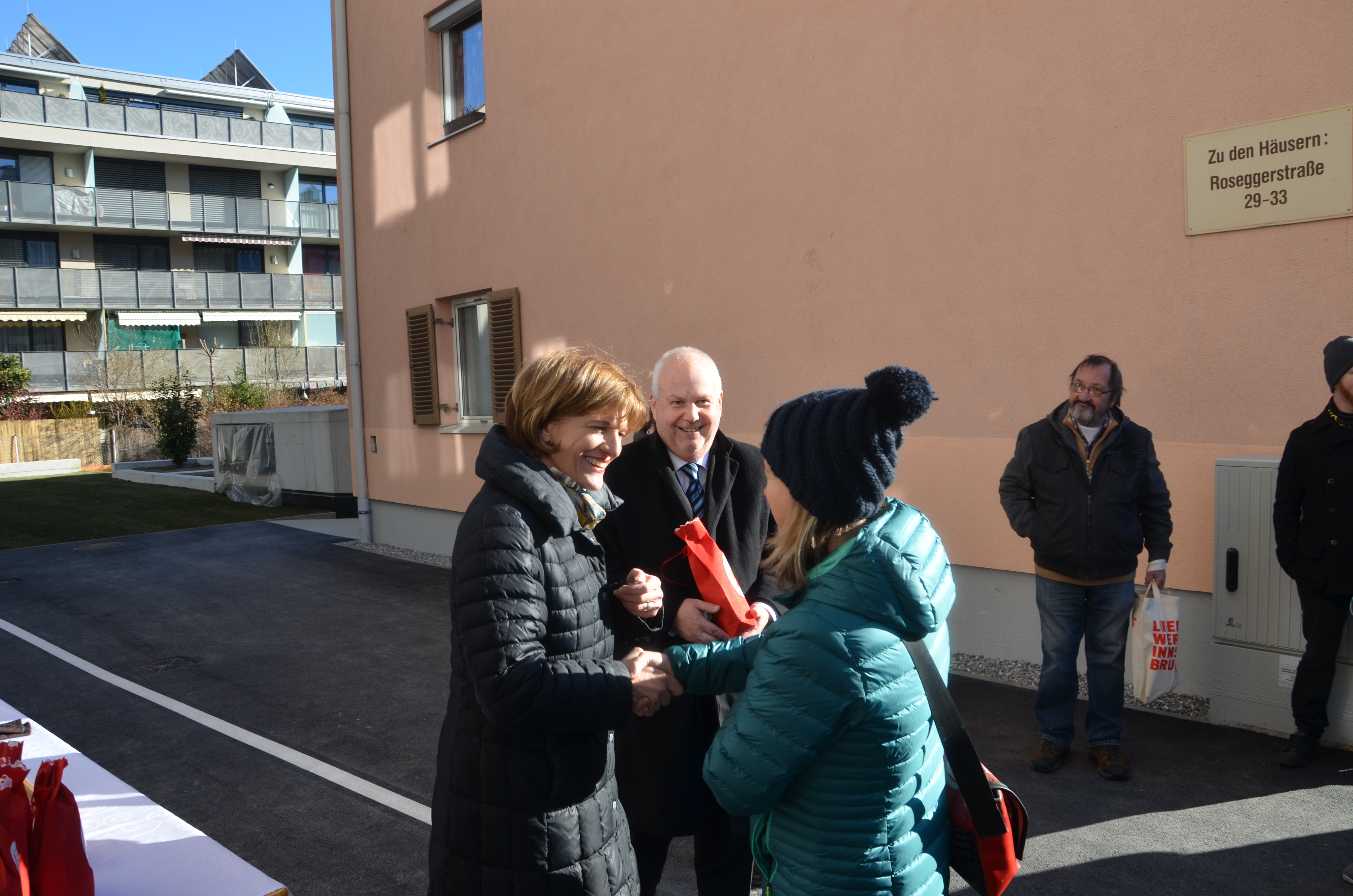 - Die feierliche Übergabe der Wohnungsschlüssel durch die ressortzuständigen PolitikerInnen wird schließlich mit einem Rundgang durch die Wohnanlage verbunden. Interessierte haben Gelegenheit, hinter die Kulissen zu blicken und können beispielsweise die Technikzentrale unter die Lupe nehmen. Bei großen Wohnanlagen wird zu diesem Anlass ein BewohnerInnenfest veranstaltet.
