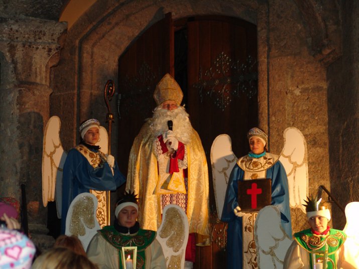 Der Nikolaus zieht mit einer Engelschar und mit Hirten ein.
