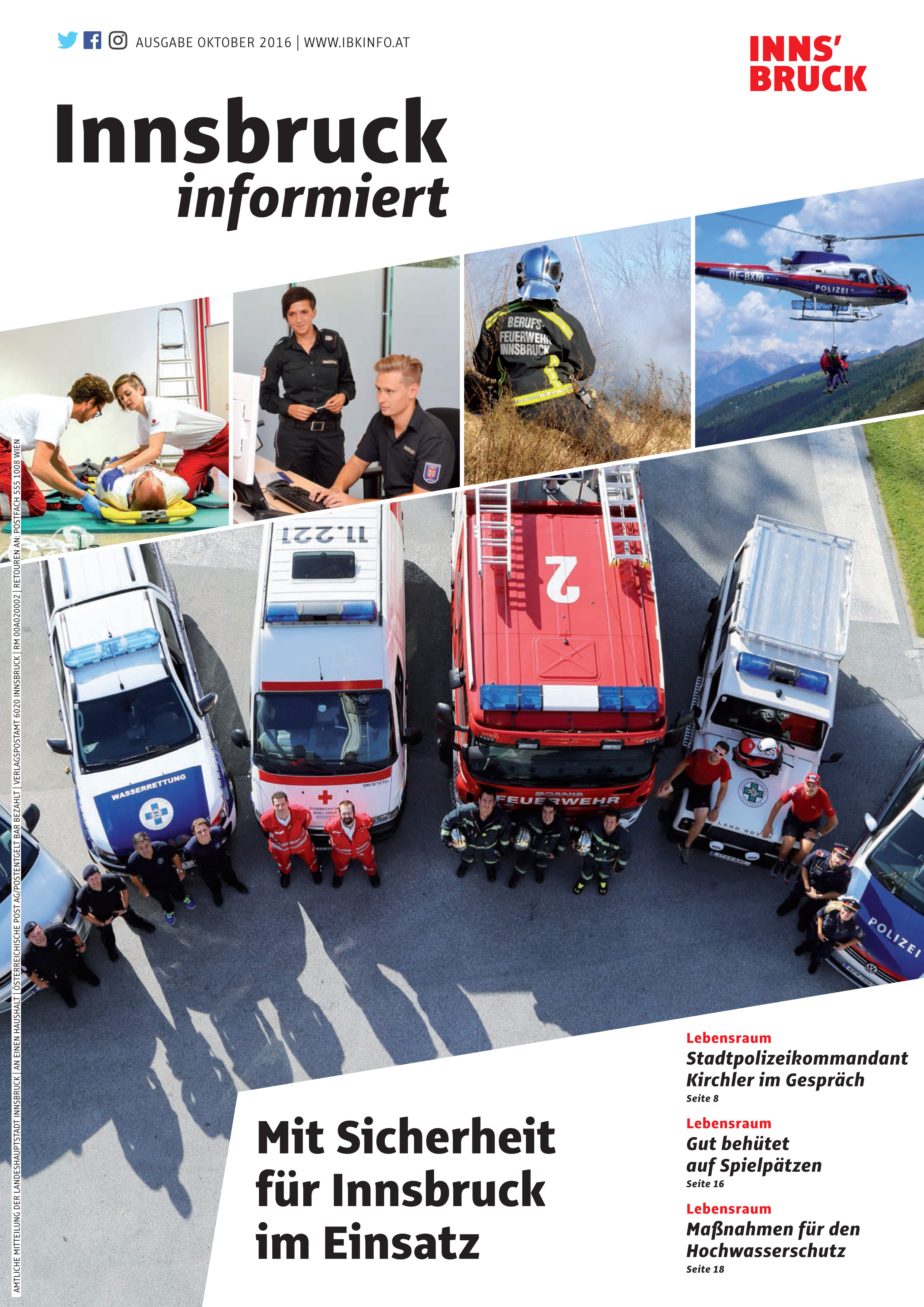 Sicherheit hat in der Tiroler Landeshauptstadt viele Gesichter: Ob im Straßenverkehr, auf Spielplätzen, in Bildungseinrichtungen, den eigenen vier Wänden, bei Einsatzorganisation wie der Berufsfeuerwehr oder in Bezug auf die Pflege des Waldes und die Betreuung von Wildbächen – das Gefühl der Sicherheit ist ausschlaggebend für die Lebensqualität. Gerade aus diesem Grund stellt die Stadt Innsbruck ebendieses in den Fokus, wie ein Blick in die aktuelle Ausgabe zeigt.