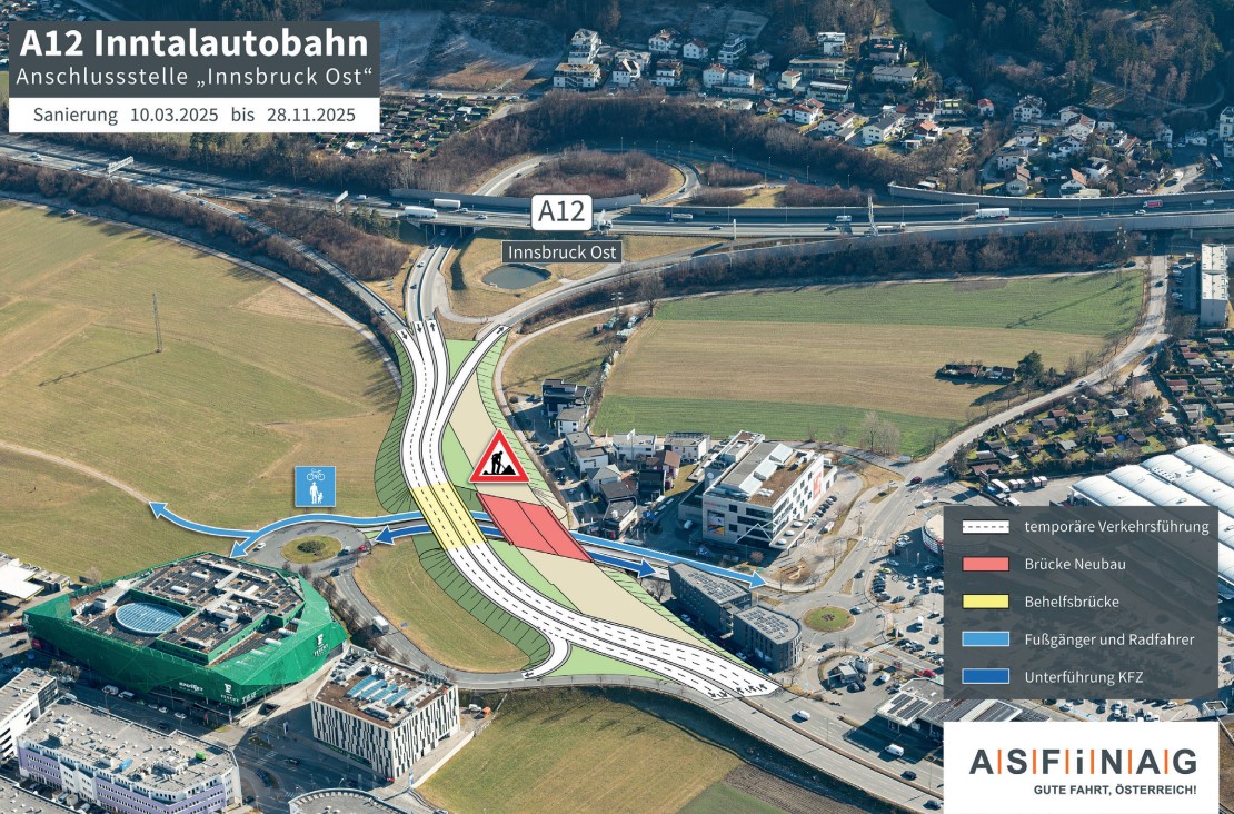 Die ASFINAG ist sich bewusst, dass gerade bei der Anschlussstelle Innsbruck-Ost viele Verkehrsteilnehmende in Richtung der Gewerbegebiete unterwegs sind und es bereits ohne Bauarbeiten an Spitzenzeiten zu Staus kommt. Genau deshalb erfolgen die Arbeiten so, dass es mit nur wenigen Ausnahmen keine Sperren von Straßen, Anschlussstellen oder Auf- und Abfahrten zur Autobahn kommen wird. Um die Belastung für alle Beteiligten möglichst gering zu halten, packt die ASFINAG möglichst viele Arbeiten in dieses Projekt, um Ende April 2026 mit allen notwendigen Sanierungen abschließen zu können.
