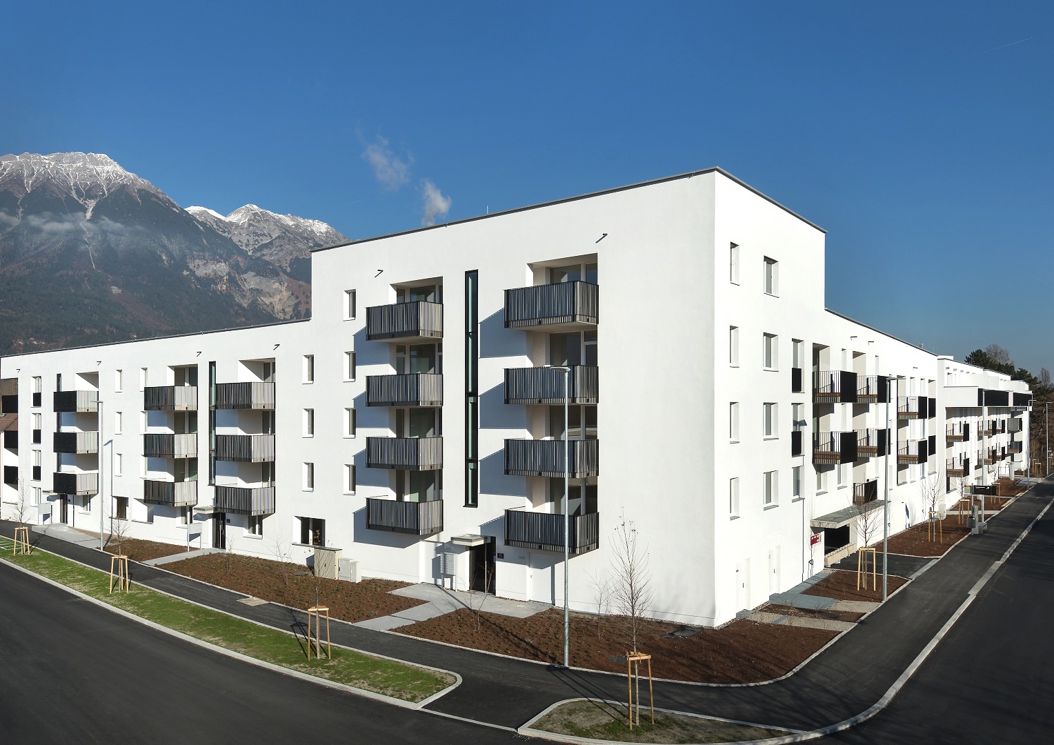 Die Neue Heimat Tirol errichtete am Areal der Südtirolersiedlung in Pradl Ost eine Wohnanlage im Passivhausstandard, mit 145 Mietwohnungen samt Tiefgarage.