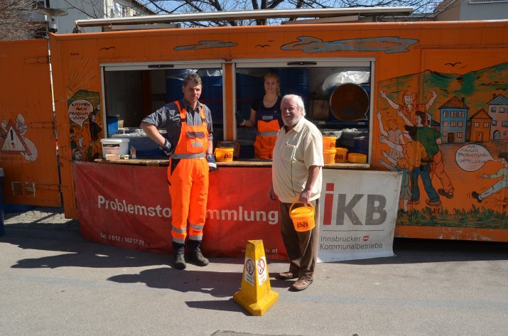 In den Innsbrucker Stadtteilen werden einzelne Sammelstellen eingerichtet und nach einem genauen Zeitplan vom Sammelwagen der IKB angefahren. Die MitarbeiterInnen der IKB nehmen dort Problemstoffe wie Farben und Lacke, Haushaltsreiniger, Lösemittel, Medikamente, Konsumbatterien, Autobatterien usw. entgegen. Auch ÖLI-Behälter können abgegeben und gegen neue Speiseölgefäße ausgetauscht werden. Altkleider werden im Rahmen der Problemstoff-Aktion nicht gesammelt. Pro Woche kommen ca. zehn Tonnen im Rahmen der mobilen Problemstoffsammlung zusammen – jährlich werden an allen Sammelstellen (incl. der fixen Standorte) 250 Tonnen Abfall gesammelt.