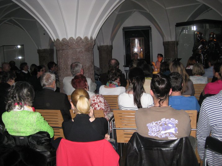Krimispannung auf höchster Ebene bot im mittelalterlichen Ambiente des Museums Goldenes Dachl die gestrige Lesung des Tiroler Autors Christian Kössler. Dieser stellte vor zahlreichen ZuhörerInnen sein neues Buch „Tiroler Sensenmann-Blues“ vor. Für die musikalische Umrahmung des Abends sorgte Thomas Kuen mit Gitarre und Didgeridoo.