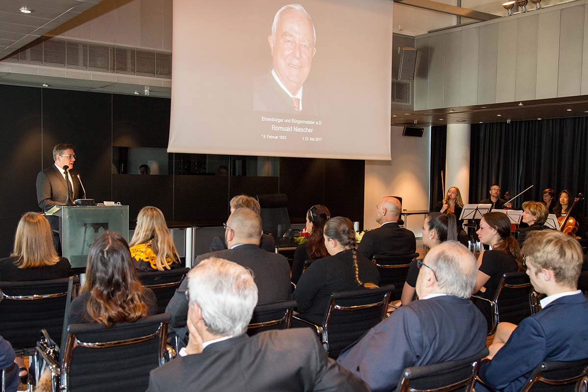 Gemeinderat Christian Haager fand ebenfalls bewegende Worte: „Mit Romuald Niescher ist eine Zeit lang ein Mann an der Spitze der Stadt gestanden, der mutig war und zu seinem Wort gestanden ist. Er hat die Geschicke der Stadt mit Herzblut geführt und auch in weniger erfolgreichen Zeiten Charakter gezeigt. Auch nach seiner politischen Laufbahn zeichnete er sich durch Engagement und Humor aus. Wir werden ihm ein ehrwürdiges Andenken gewähren.“