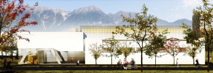 Das aus einem Architektenwettbewerb hervor gegangene und nunmehr zur Ausführung gelangende Projekt der Innsbrucker LAAC Architekten sieht einen westseitigen Zubau zur bestehenden Turnhalle vor und präsentierte sich als selbständiger Baukörper. Ein geschlossener Kubus schwebt über einer eleganten Tragkonstruktion. Dadurch ergibt sich eine sinnvolle Transparenz im Zugangsbereich.