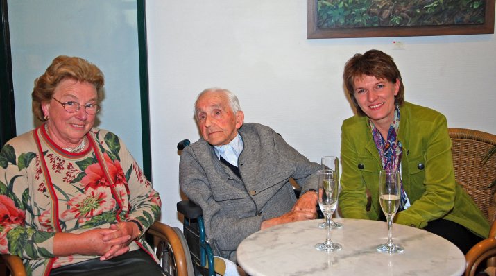 Ganz erstaunt vom Besuch der Bürgermeisterin zeigte sich auch Alois Rager. Der rüstige 103-Jährige freute sich aber nicht nur über die Flasche Wein, die ihm Bgm. Oppitz-Plörer überreichte, sondern auch über das gemütliche Gespräch, dem auch seine Gattin beiwohnte.