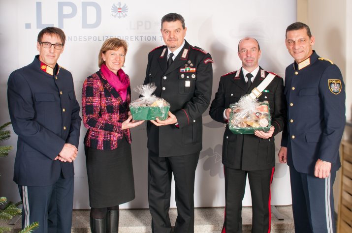 Landespolizeidirektor Mag. Helmut Tomac und Bürgermeisterin Mag.a Christine Oppitz-Plörer nutzten am 12. Dezember im Beisein von Stadtpolizeikommandant Oberst Martin Kirchler gemeinsam die Gelegenheit, sich in der Landespolizeidirektion Tirol für den Einsatz der beiden italienischen Beamten zu bedanken.