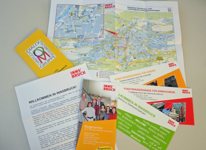 Im Rahmen der Willkommensspaziergänge wird an die TeilnehmerInnen ein „Interreligiöser Stadtplan“, der von der christlich-muslimischen Dialoggruppe erstellt und von der Integrationsstelle der Stadt Innsbruck zum Großteil finanziert wurde.