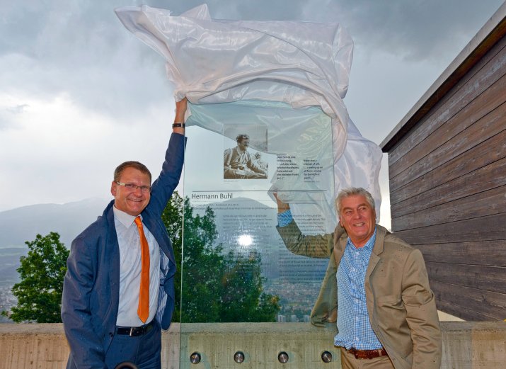 Im Beisein von Buhls Frau Eugenie, der Pionierin des Frauenbergsteigens Helma Schimke und dem Expeditionsfilmer Norman Dyrenfurth fand vergangenen Dienstag die feierliche Einweihung des Hermann-Buhl-Platzes durch Innsbrucks Bürgermeisterin Christine Oppitz-Plörer und Alpenvereinspräsident Dr. Andreas Ermacora statt.