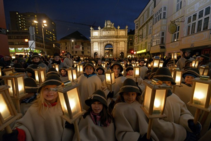 Um 17.00 Uhr setzt sich dann der feierliche Zug in Bewegung. Von der Triumphpforte führt der Weg über Maria-Theresien-Straße, Marktgraben, Herzog-Otto-Straße und Herrengasse bis zum Platz vor dem Tiroler Landestheater und bietet so reichlich Gelegenheit, den gesamten Zug zu bestaunen. Die Hirten und Engel mit ihren Laternen bringen einen warmen Lichterglanz in die Innenstadt und bereiten den Weg für das Christkind in seinem strahlenden, prunkvollen Wagen. An zwei Stationen (Rathaus, ca. 17.20 Uhr, und Marktplatz, ca. 17.40 Uhr) werden die traditionellen Lieder „Jetzt fangen wir zum Singen an“, „Kommet ihr Hirten“ und „Es wird scho glei dumpa“ gesungen, die sich als vorweihnachtliche Klangwolke über die Innsbrucker Innenstadt legen.